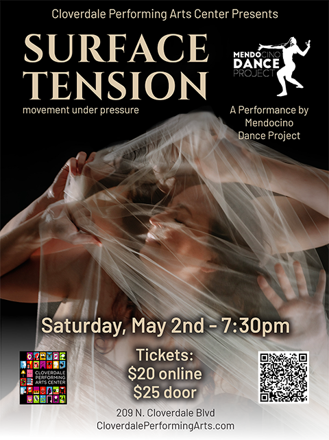 Mendocino Dance Project’s newest work in theaters uses contemporary dance to express the times we are currently living. It is a challenge to remain grounded and stay in touch with our own humanity as we are constantly confronted by so much turbulence in the world. Surface Tension explores how we find each other and stay resilient amongst the chaos. Artistic director Kara Starkweather weaves together a variety of themes into an evening length performance with dancers Emily Anthony, Priya Birchard, Jessica Curl, Mackenzie Rain, and Natalie Thiel-Gebheim.